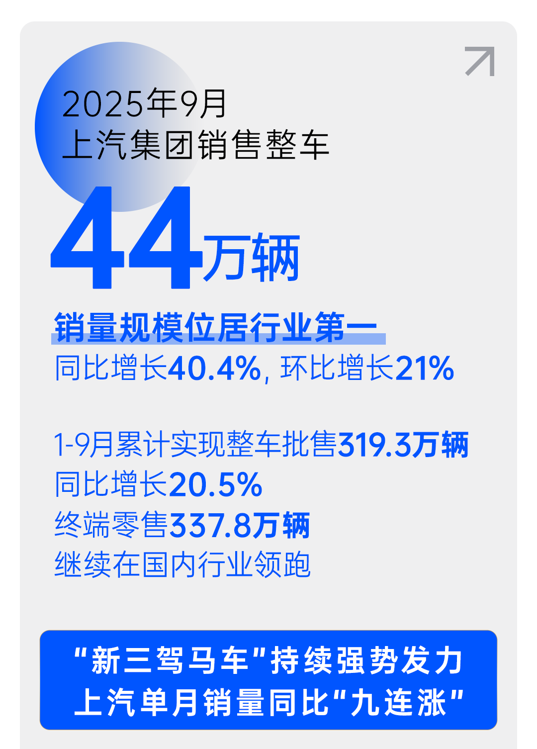 上汽集团表示,今年以来,上汽月销量已实现同比“九连涨”,1-9 月累计实现整车批售 319.3 万辆,同比增长 20.5%,终端零售 337.8 万辆,继续在国内行业领跑。