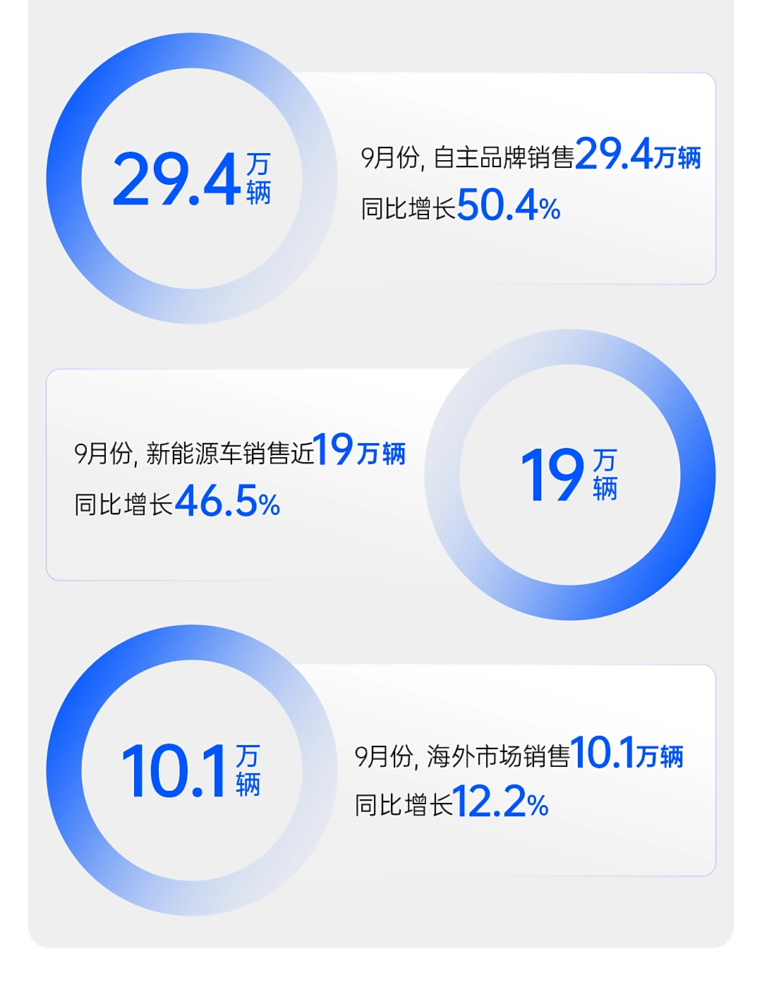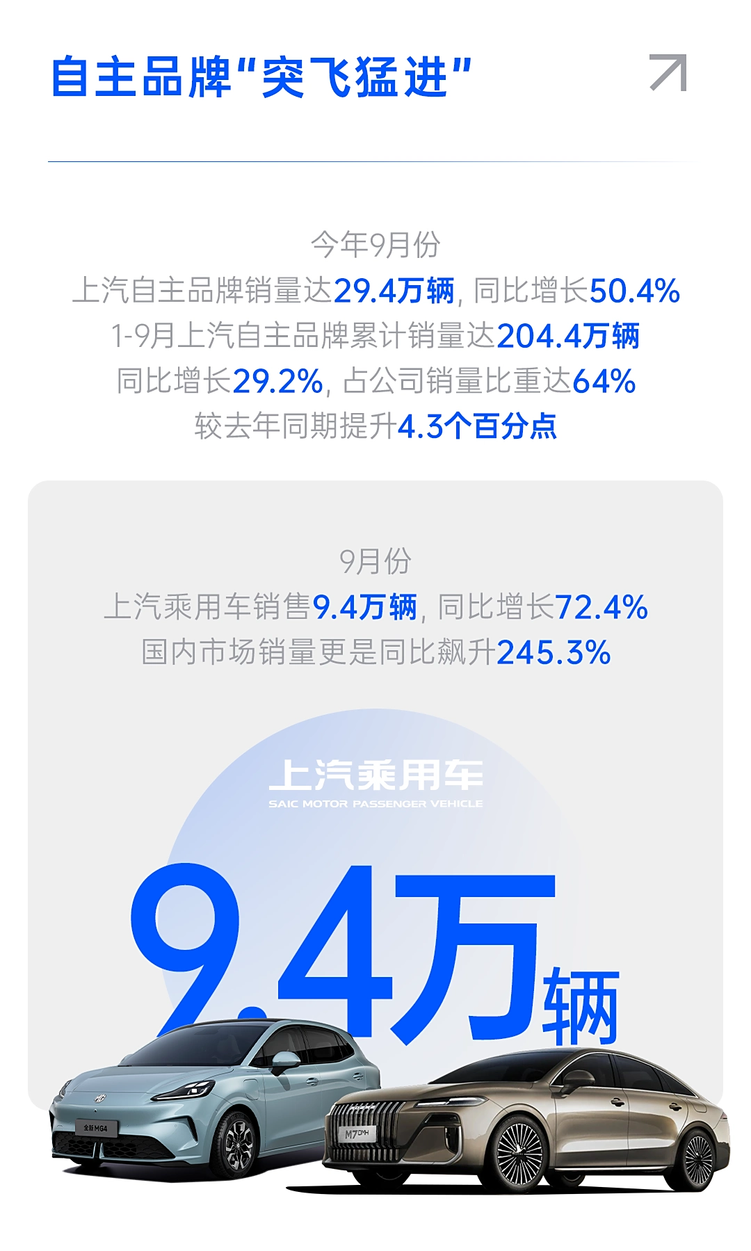 今年 9 月份,上汽自主品牌销售 29.4 万辆,同比增长 50.4%。IT之家从官方获悉,其中新能源车销售近 19 万辆,同比增长 46.5%。